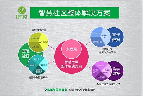 针对市面上出现的比较多的智慧社区案例,这里我们具体以零壹互联的智慧社区整体解决方案为例,进行详细和具体分析。基于部分了解和调查,零壹互联的智慧社区整体解决方案,是基于大数据平台,将用户的消费数据、喜好数据和基础数据进行分析和整理,并依据不同的数据建立不同的系统平台,如消费数据基础下的智慧社区生活服务平台,喜好数据下的全媒体广告平台,以及基础数据下智慧物业管理系统和智能安防产品。而零壹互联的智慧社区的整体解决方案则是基于移动互联网、物联网和大数据系统三大核心技术,将社区智能安防硬件、智慧物业管理系统、智慧社区全媒体广告平台、智慧社区生活服务平台和智能家居等多个开放平台连接起来的系统。零壹互联的理念则是化多为整,化整为零。一个系统解决智慧社区中物业和地产的主要问题。
